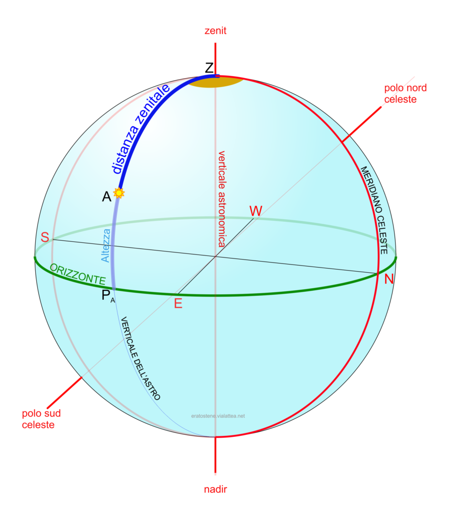 La figura a fianco rappresenta un angolo azimutale $N\hat{Z}P_A$ di specie est misurato da un osservatore boreale (il verticale di origine contiene il polo nord celeste).
